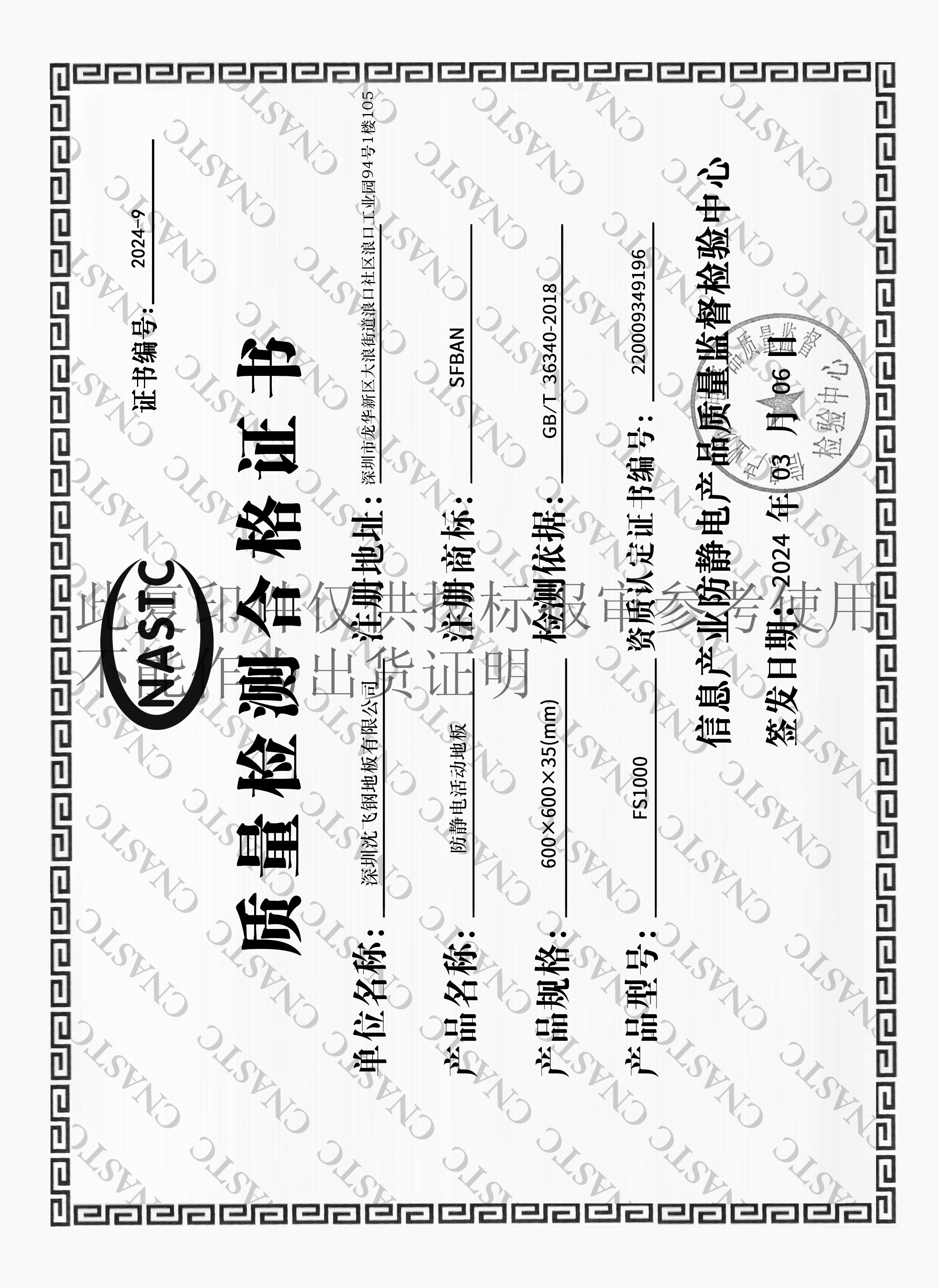 本公司防靜電地板產(chǎn)品通過GB/T 36340-2018標(biāo)準(zhǔn),經(jīng)檢測機(jī)構(gòu)“信息產(chǎn)業(yè)防靜電產(chǎn)品質(zhì)量監(jiān)督檢驗(yàn)中心”檢驗(yàn)通過符合國家有關(guān)標(biāo)準(zhǔn)及要求。